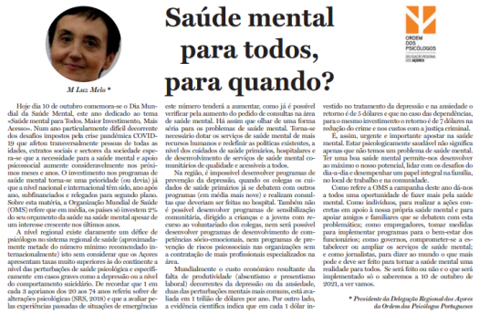 No dia 10 de Outubro comemorou-se o Dia Mundial da Saúde Mental, este ano dedicado ao tema «Saúde mental para Todos. Maior Investimento, Mais Acesso». Num ano particularmente difícil espera-se que a necessidade para a saúde mental e apoio psicossocial aumente consideravelmente nos próximos meses e anos. Clique em "Ler mais" para ler as palavras de Luz Melo, Presidente da DRA da OPP.
