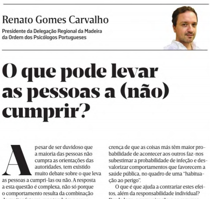 "Perceber o que faz uma pessoa cumprir implica olhar para a interação de características individuais como a propensão para o risco ou até o narcisismo e para dimensões sociais como a desigualdade social, a polarização e a relação individualismo/coletivismo. Mas porque já não estamos em abril de 2020, a experiência de um ano em pandemia permite-nos olhar para alguns aspetos." - escreve Renato Gomes Carvalho, presidente da DRM da OPP. Clique em "Ler mais" para ler o artigo completo.