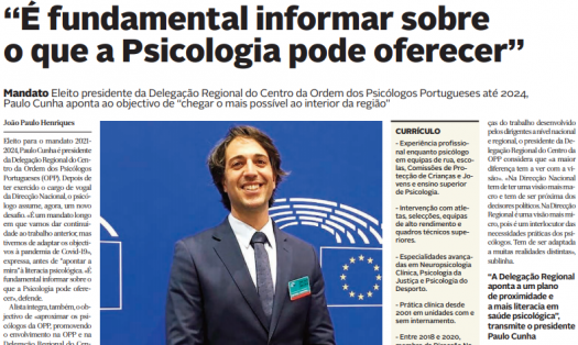 “A Delegação Regional aponta a um plano de proximidade e a mais literacia em saúde psicológica”, transmite o presidente Paulo Cunha. Clique em "Ler mais" para conhecer um pouco melhor o presidente da DRC da OPP e os seus objectivos para o mandato 2021-2024.