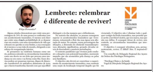 "Alguns estudos demonstram que existe uma percentagem de 70% de uma pessoa se confrontar com um acontecimento traumático O mesmo será dizer que existe uma elevada probabilidade de se deparar com um cenário, com uma circunstância de vida que colocará em questão os seus limites, a sua concepção de si mesmo e a sua visão do mundo, obrigando a um esforço de reorganização interior." Clique em "Ler Mais" para continuar a ler o artigo de opinião de Filipe Fernandes, Vogal da Direcção Regional dos Açores.