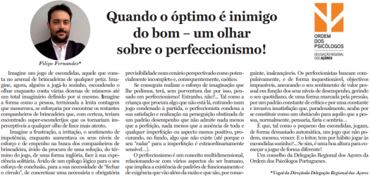 "O perfeccionismo é um conceito multidimensional, relacionando-se com vários aspectos do ser humano, que implica a existência de padrões de funcionamento e de exigência que vão além da razão e que são, por conseguinte, inalcançáveis", escreve Filipe Fernandes, vogal da Direcção da DRA da OPP. Clique em "Ler mais" para ler o artigo sobre perfeccionismo.