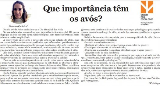 "A convivência entre avós e netos não está só na relação de afeto, mas na transmissão de valores e experiências que influenciam positivamente o nosso desenvolvimento enquanto pessoas." Para continuar a ler o artigo de opinião de Catarina Cordeiro no Diário dos Açores, clique em "Ler Mais".