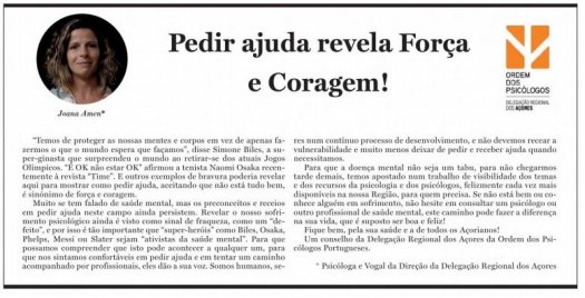 "mostrar como pedir ajuda, aceitando que não está tudo bem, é sinónimo de força e coragem." Para continuar a ler o artigo de opinião de Joana Amen, no Diário dos Açores, clique em "Ler Mais"