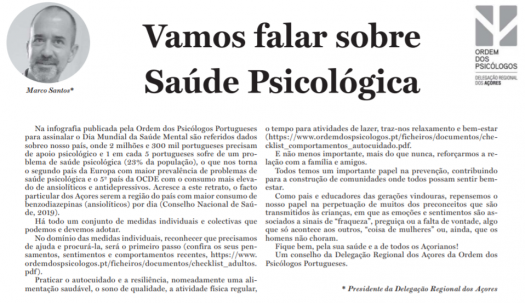Portugal é "o segundo país da Europa com maior prevalência de problemas de saúde psicológica e o 5º país da OCDE com o consumo mais elevado de ansiolíticos e antidepressivos. Acresce a este retrato, o facto particular dos Açores serem a região do país com maior consumo de benzodiazepinas (ansiolíticos) por dia (Conselho Nacional de Saúde, 2019)", declara Marco Santos, Presidente da DRA da OPP. Clique em "Ler mais" para ler o artigo completo.