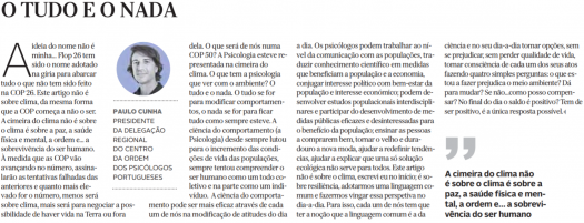 "A Psicologia esteve representada na cimeira do clima. O que tem a psicologia que ver com o ambiente? O tudo e o nada. O tudo se for para modificar comportamentos, o nada se for para ficar tudo como sempre esteve", escreve Paulo Cunha, Presidente da DRC da OPP. Clique em "Ler mais" para ler o seu artigo.
