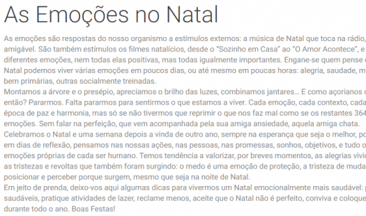"No Natal podemos viver várias emoções em poucos dias, ou até mesmo em poucas horas: alegria, saudade, medo, vergonha, culpa, raiva, e tristeza, algumas destas emoções bem primárias, outras socialmente treinadas", escreve Carmen Gonçalves. Clique em "Ler mais" para ler o artigo completo.