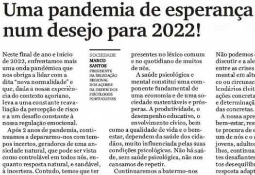 "A saúde psicológica e mental constitui uma componente fundamental de uma economia e de uma sociedade sustentáveis e prósperas. A produtividade, o desempenho educativo, o envolvimento cívico, bem como a qualidade de vida e o bem-estar, dependem da saúde dos cidadãos, muito influenciada pelas suas condições psicológicas", escreve Marco Santos, Presidente da DRA da OPP. Clique em "Ler mais" para ler o artigo.