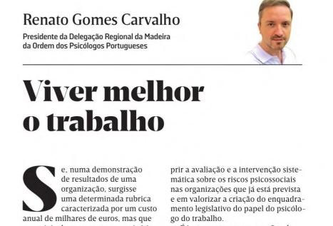 "Vários indicadores evidenciam o impacto que as questões de saúde psicológica têm no trabalho. Sabe-se, por exemplo, que mais de metade dos dias de trabalho perdidos decorrem de problemas na esfera da saúde psicológica." Afirma Renato Gomes Carvalho no seu artigo de opinião Mensal no Jornal da Madeira.