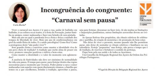 "Mais um ano no qual a pandemia leva a festa e deixa a saudade dos tempos de liberdade de viver. Mais um ano de condicionalismos em prol da saúde física de todos. E a saúde psicológica? Como fica? Como a protegemos deste “não poder viver”?" Artigo de opinião de Carla Rocha, Membro da Delegação Regional dos Açores da Ordem dos Psicólogos Portugueses.