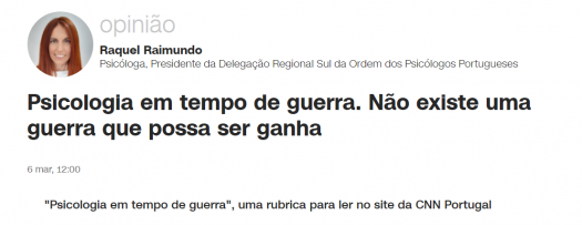 "Psicologia em tempo de guerra" é uma rubrica do site da CNN Portugal em parceria com a OPP. Leia o artigo de opinião de Raquel Raimundo, presidente da Delegação Regional Sul da Ordem dos Psicólogos Portugueses.