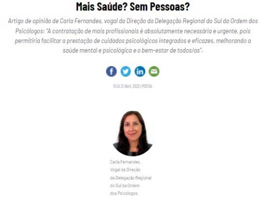“A contratação de mais profissionais é absolutamente necessária e urgente, pois permitiria facilitar a prestação de cuidados psicológicos integrados e eficazes, melhorando a saúde mental e psicológica e o bem-estar de todos/as”. Artigo de opinião de Carla Fernandes, vogal da Direção da Delegação Regional do Sul da Ordem dos Psicólogos Portugueses ao jornal Postal do Algarve.