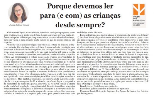 "A leitura está ligada a uma série de benefícios tanto para pequenos como para graúdos. Mas o gosto pela leitura é, sem sombra de dúvida, muito influenciado pelos hábitos que são promovidos e incentivados desde criança, pelo que valerá a pena investir neste campo no que às nossas crianças diz respeito". O artigo de opinião de Joana Esteves Cunha, para ler no Diário dos Açores.