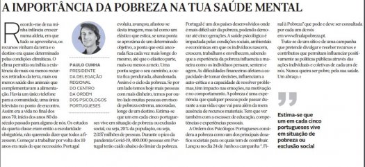 "Se por um lado temos hoje mais pessoas com mais dinheiro, temos por outro lado muitas pessoas em risco de pobreza extrema, ancoradas, longe de um destino. Estima-se que um em cada cinco portugueses vive em situação de pobreza ou exclusão social, ou seja, 20% da população, ou seja, 2.037 milhões de pessoas." O artigo de opinião de Paulo Cunha, Presidente da Delegação Regional do Centro, no Diário de Coimbra.