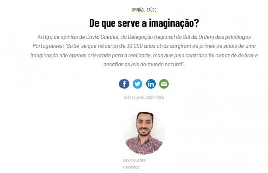 "Era uma vez… Um gigante com pés de loiça, asas de prata e cabeça de leão. Uma cidade microscópica no buraco de uma agulha, que se desfaz e refaz ao passar de cada linha. Uma floresta ao contrário, de raízes celestes e papagaios a rasar o chão. Por mais absurda que seja a imagem, o provável é que as tenha conseguido encenar na sua mente sem esforço nem vontade.". O artigo de opinião do psicólogo David Guedes, sobre a imaginação, para ler no Postal do Algarve.