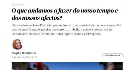"O lazer não é um luxo! É tão vital para o cérebro e para a sociedade, como a vitamina C é para o corpo! Contudo, nos dias que correm, o trabalho a mais e a pressão são até considerados símbolos de estatuto, numa espécie de novo esclavagismo!" O artigo de opinião de Raquel Raimundo, Presidente da Delegação Regional do Sul da OPP, no jornal Ímpar (Público).