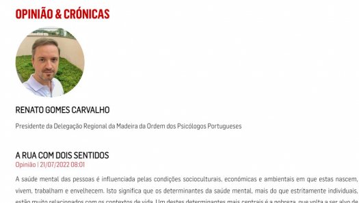 "A saúde mental das pessoas é influenciada pelas condições socioculturais, económicas e ambientais em que estas nascem, vivem, trabalham e envelhecem. Isto significa que os determinantes da saúde mental, mais do que estritamente individuais, estão muito relacionados com os contextos de vida. Um destes determinantes mais centrais é a pobreza, que volta a ser alvo de atenção especialmente num tempo como este, em que uma crise sucede outra e em que a perda de rendimentos afeta muitas pessoas." Artigo de opinião de Renato Carvalho, Presidente da Delegação Regional da Madeira, no Jornal da Madeira.