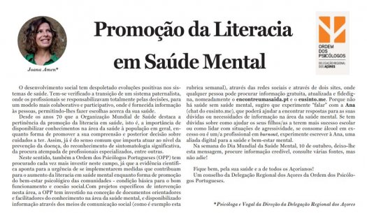 "Assim, já é do senso comum que importa atuar ao nível da prevenção da doença, do reconhecimento de sintomatologia significativa, da procura atempada de profissionais especializados, entre outras." Artigo de opinião de Joana Ámen, Psicóloga e Vogal da Direcção da Delegação Regional dos Açores da OPP.