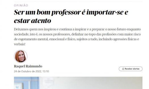 "Deixamos quem nos inspirou e continua a inspirar e a preparar o nosso futuro enquanto sociedade, isto é, os nossos professores, definhar no topo das profissões com maior risco de esgotamento mental, emocional e físico, sujeitos a tudo, incluindo agressões físicas e verbais!" Artigo de opinião de Raquel Raimundo, Presidente da Delegação Regional do Sul da OPP, para ler no Ímpar (Público).