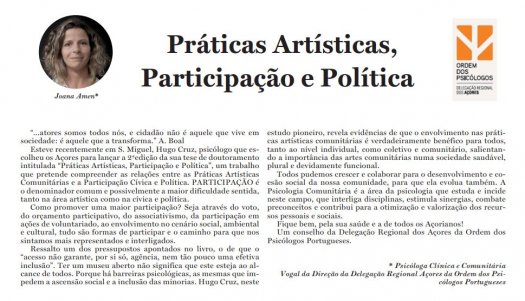 "Todos podemos crescer e colaborar para o desenvolvimento e coesão social da nossa comunidade, para que ela evolua também. A Psicologia Comunitária é a área da psicologia que estuda e incide neste campo, que interliga disciplinas, estimula sinergias, combate preconceitos e contribui para a otimização e valorização dos recursos pessoais e sociais." Artigo de opinião de Joana Amen, Vogal da Direcção da Delegação Regional dos Açores da OPP, no Diário dos Açores.