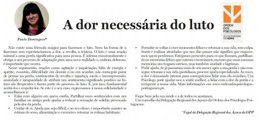 "O luto é uma reação natural a uma perda significativa para uma pessoa. É intensa emocionalmente e obriga a um processo de adaptação para uma nova realidade e, embora doloroso, é importante que ocorra." Artigo de opinião de Paula Domingues, psicóloga e vogal da Delegação Regional dos Açores, no Diário dos Açores.