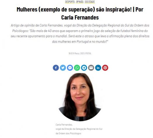 "São mais de 40 anos que separam o primeiro jogo da seleção de futebol feminina do seu recente apuramento para o mundial. Será este o atraso que leva a afirmação plena dos direitos das mulheres em Portugal e no mundo?" Artigo de opinião de Carla Fernandes, vogal da Delegação Regional Sul da OPP, no Postal do Algarve.
