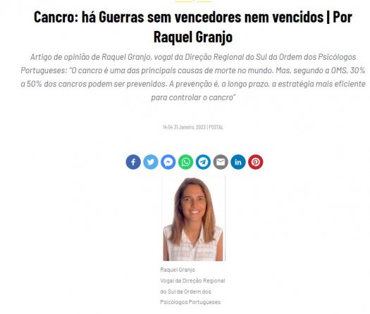 “O cancro é uma das principais causas de morte no mundo. Mas, segundo a OMS, 30% a 50% dos cancros podem ser prevenidos. A prevenção é, a longo prazo, a estratégia mais eficiente para controlar o cancro”. Artigo de opinião de Raquel Granjo, vogal da Delegação Regional do Sul, no Postal do Algarve.