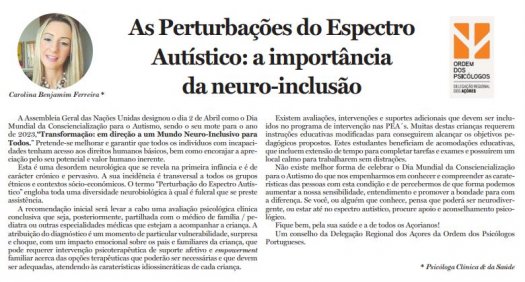 "Não existe melhor forma de celebrar o Dia Mundial da Consciencialização para o Autismo do que nos empenharmos em conhecer e compreender as características das pessoas com esta condição e de percebermos de que forma podemos aumentar a nossa sensibilidade, entendimento e promover a bondade para com a diferença." Artigo de opinião de Carolina Benjamin Ferreira, Psicóloga Clínica e da Saúde, no Diário dos Açores.