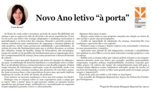 "Com maiores ou menores mudanças o novo ano trás sempre novidade! Dialogar com as crianças sobre as suas expectativas para a etapa que se inicia “abre a porta” para os pais possam validar as emoções menos agradáveis que possam surgir, acolhendo-as e normalizando-as enquanto reação adaptativa perante o novo e o desconhecido." Artigo de opinião de Carla Rocha, vogal da direcção da Delegação Regional dos Açores, para ler no Diário dos Açores.