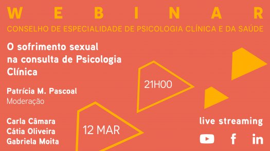 Carla Câmara (Serviço de Saúde da Região Autónoma da Madeira), Cátia Oliveira (Hospital CUF Porto) e Gabriela Moita (Conselho de Especialidade de Psicologia Clínica e da Saúde) são as convidadas deste webinar que terá a moderação de Patrícia M. Pascoal (Universidade Lusófona de Lisboa - Centro Universitário de Lisboa).