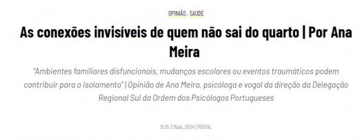 "Se um tempo de privacidade e introspecção é saudável e até mesmo necessário para o desenvolvimento pessoal, o comportamento persistente de isolamento pode ser indicativo de características próprias ou de problemas subjacentes que necessitam de cuidado." Artigo de opinião de Ana Meira, vogal da Delegação Regional do Sul, para ler no Postal do Algarve.